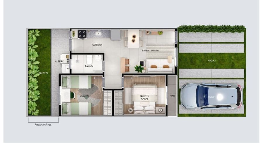 Casa com 2 quartos bem distribuídos, sala aconchegante, cozinha funcional, banheiro social, garagem e área privativa, perfeita para quem valoriza seu próprio espaço para momentos de lazer e tranquilidade.